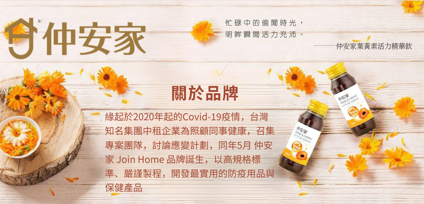 緣起於2020年起的Covid-19疫情,台灣知名集團中租企業為照顧同事健康,召集專案團隊,討論應變計劃,同年5月 仲安家 Join Home 品牌誕生,以高規格標準、嚴謹製程,開發最實用的防疫用品與保健產品。 與此同時,也將這份心意傳遞給社會大眾,共同守護彼此身體健康狀況和居家安全。提供益生菌、葉黃素精華飲、抗菌噴霧、醫療級口罩,更多優質保健商品歡迎選購。